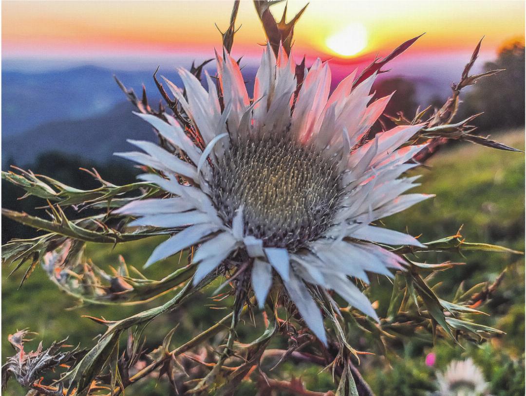 Silberdistel im Abendlicht, bringt Silberglanz aufs Hörnli.