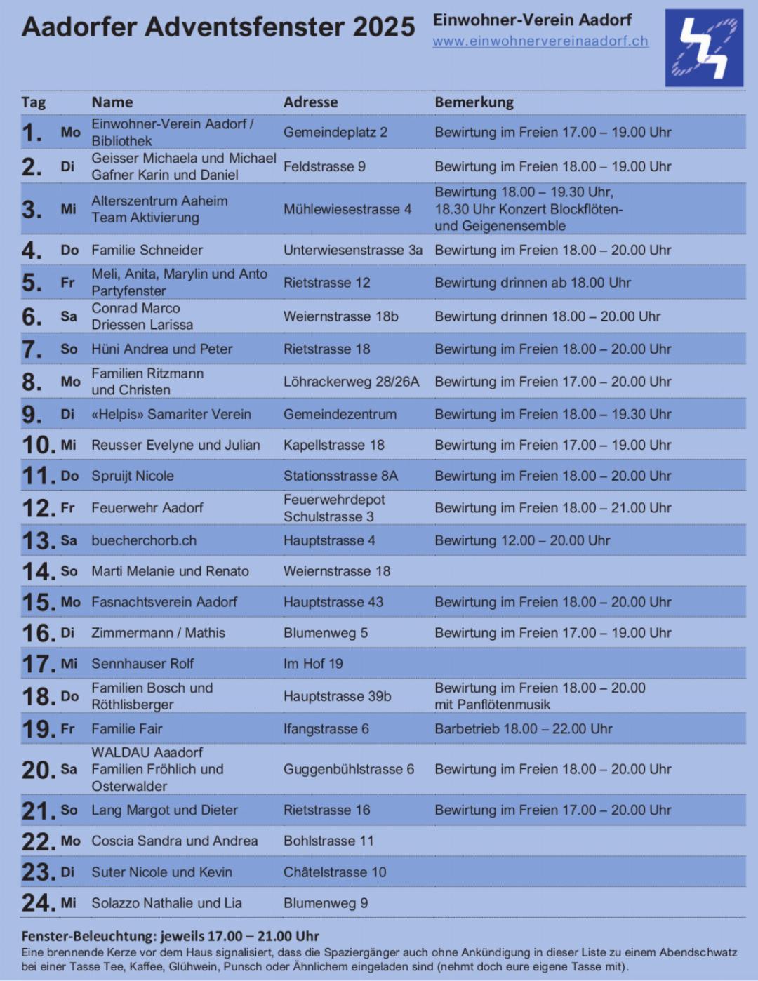 Aus dem Plan unten sind die Orte der einzelnen Adventsfenster sowie die diversen Gastgeber ersichtlich. Ein herzliches ...