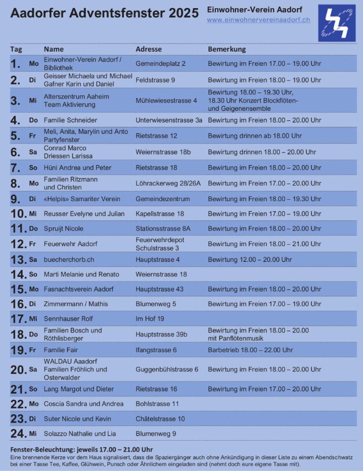 Aus dem Plan unten sind die Orte der einzelnen Adventsfenster sowie die diversen Gastgeber ersichtlich. Ein herzliches Dankeschön geht an alle kreativen Mitwirkenden. Der Einwohner-Verein Aadorf wünscht eine besinnliche und frohe Vorweihnachtszeit und möchte zu Abendspaziergängen mit spannenden Begegnungen anregen.
