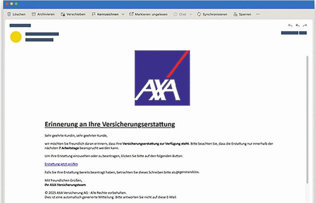 Die gefälschten E-Mails erwecken den Eindruck, von der AXA Versicherungen AG zu stammen, und kündigen eine angebliche Rückerstattung an. Um zusätzlichen Druck aufzubauen, wird behauptet, diese sei nur noch während der nächsten sieben Tage möglich, was die Empfangenden zu einer raschen Reaktion verleiten soll.