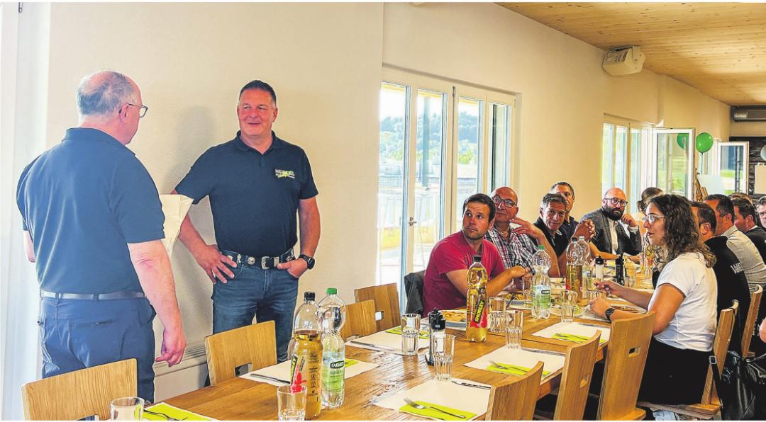 Dass hier ein innovatives Unternehmen und Team am Werk ist, zeigte sich unter anderem auch an den Wortspielen mit den Firmennamen. Dieser wurde in verschiedene Bezeichnungen eingebaut, ein Beispiel ist das «Heimätli» im obersten Stock. Die Mitarbeiter waren als Heimwerker, Geheimdienstler, der Chef der als Geheimagent angeschrieben, je nach Funktion im Unternehmen. Anschliessend konnten sich die Gewerbler beim Mittagessen austauschen oder weitere Fragen stellen. Firmeninhaber Stefan Reisp erhielt von Markus Mazenauer, Vizepräsident des Gewerbevereins Aadorf, ein Geschenk als Dankeschön.