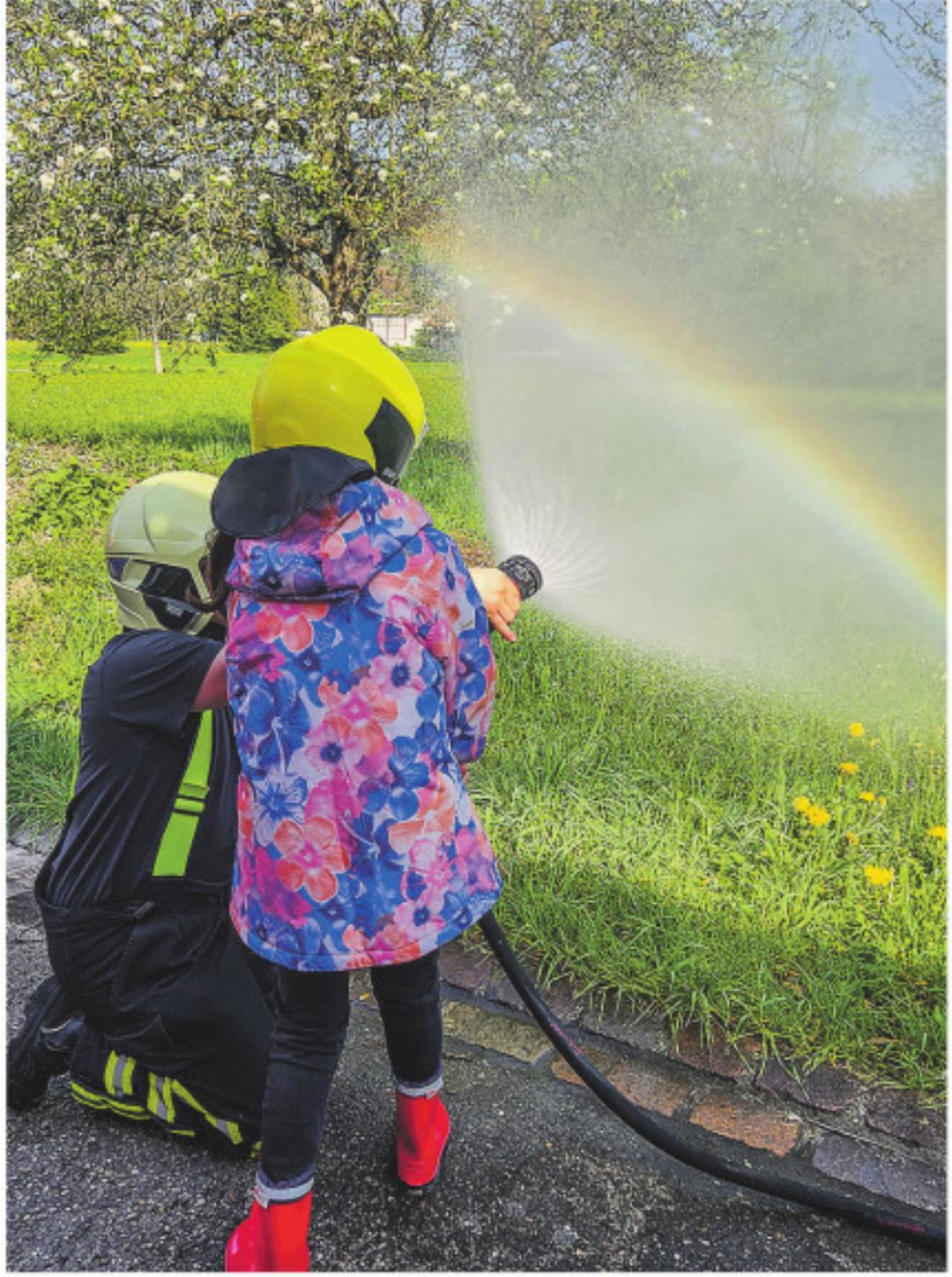 Der Höhepunkt des Tages war für viele das Löschen eines kleinen Feuers. Unter sorgfältiger Anleitung durften die Kinder selbst den Schlauch halten. Als der Ruf «Wasser marsch!» ertönte, bespritzten die Kinder mit einem grossen Schlauch die Wiese, während andere mit einem kleinen, selbst zu pumpenden Schlauch direkt auf die Flammen zielten. Die Begeisterung war riesig. «Das fühlte sich an wie ein richtiger Einsatz», erzählte ein Kind mit leuchtenden Augen. Ein anderes lachte: «Ich wollte gar nicht mehr aufhören zu spritzen.»