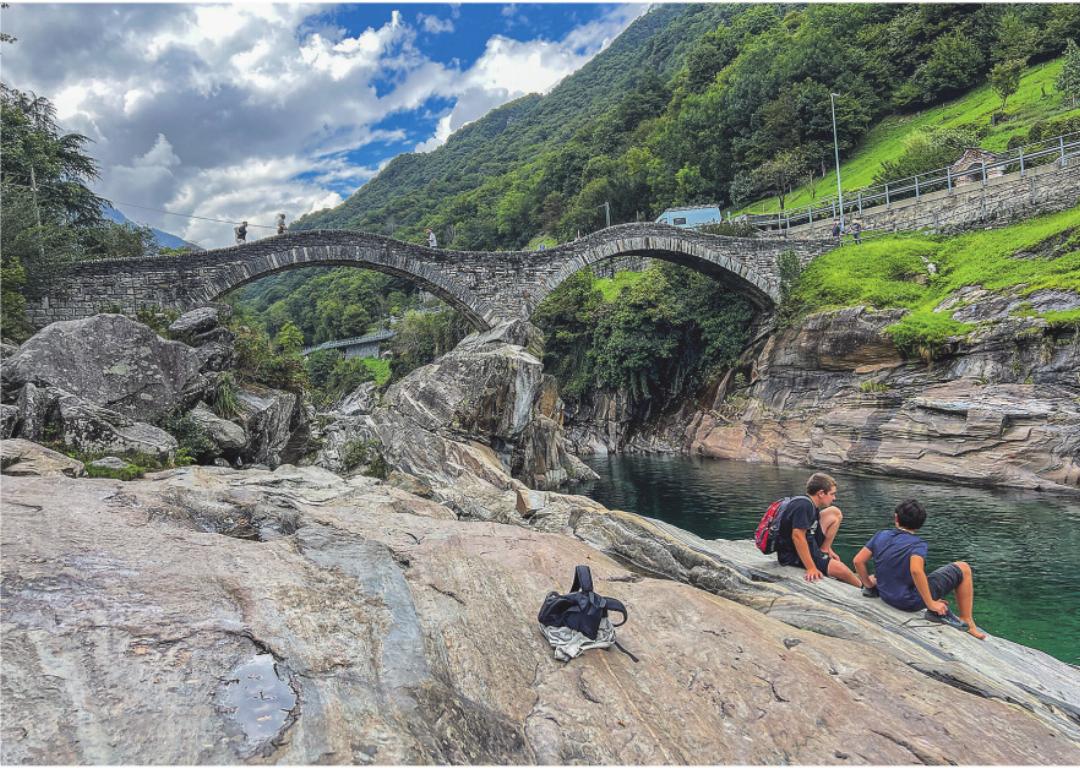Um 6.30 Uhr weckten uns die Lehrer. Danach hatten wir 30 Minuten Zeit, um uns zum Buffet zu begeben, wo wir alle frühstückten. Nach dem Frühstück hatten wir noch Zeit zum Zähneputzen und Wanderschuhe anziehen. Es war dann recht heftig am regnen, als wir zur Bushaltestelle liefen. Von dort fuhren wir eine Stunde das Verzascatal hoch, bis wir in Sonogno bei einem Wald ankamen. Danach wanderten wir dem Verzascafluss entlang talabwärts. Unterwegs assen wir noch ein Sandwich zum Mittagessen und liefen wieder weiter. Nach ein paar Pausen sahen wir eine alte Frau, die über ein Stück Holz stolperte und umfiel. Danach liefen wir weiter bis Lavertezzo. Bei der bekannten geschwungenen Steinbrücke waren Leute am Baden. Für uns war es aber zu kühl und so warteten wir am Ufer, bis der Bus kam. Wir fuhren zum «Campo sportivo» nach Tenero zurück. Danach konnten wir im Zelt chillen und freuten uns auf das Abendessen. Nach diesem hatten wir Zeit, uns auf dem Camp frei aufzuhalten. Von 21 Uhr bis 22 Uhr haben wir ein Gämschturnier gespielt, nach einer Runde gingen ein paar zurück ins Zelt. Und die anderen jassten noch ein bisschen. Nach der Jassrunde gingen alle zurück ins Zelt, weil dann Nachtruhe war.