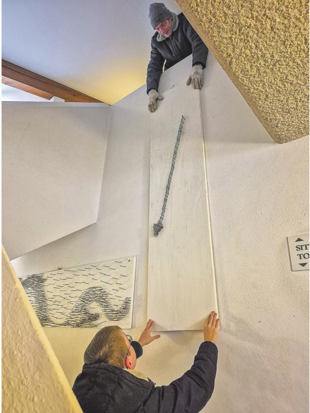 Viele Hände aus der Pfarrei haben an den beiden Nagelbildern mitgewirkt. Die beiden Nagel-Bretter wurden von Hansjakob Steinemann und Dominik Goldmann aufgehängt. Nun wurden sie nach dem Sonntags-Gottesdienst vom 8. März durch Gemeindeleiter Jürgen Kaesler gesegnet. Der Pfarreirat hat dazu feine Zöpfe gebacken, die im Gottesdienst zum Thema Dank ebenfalls mit anderen Utensilien des Pfarreirates einen Platz hatten. Bei einem Apéro konnten man die Nagelbilder in Augenschein nehmen.