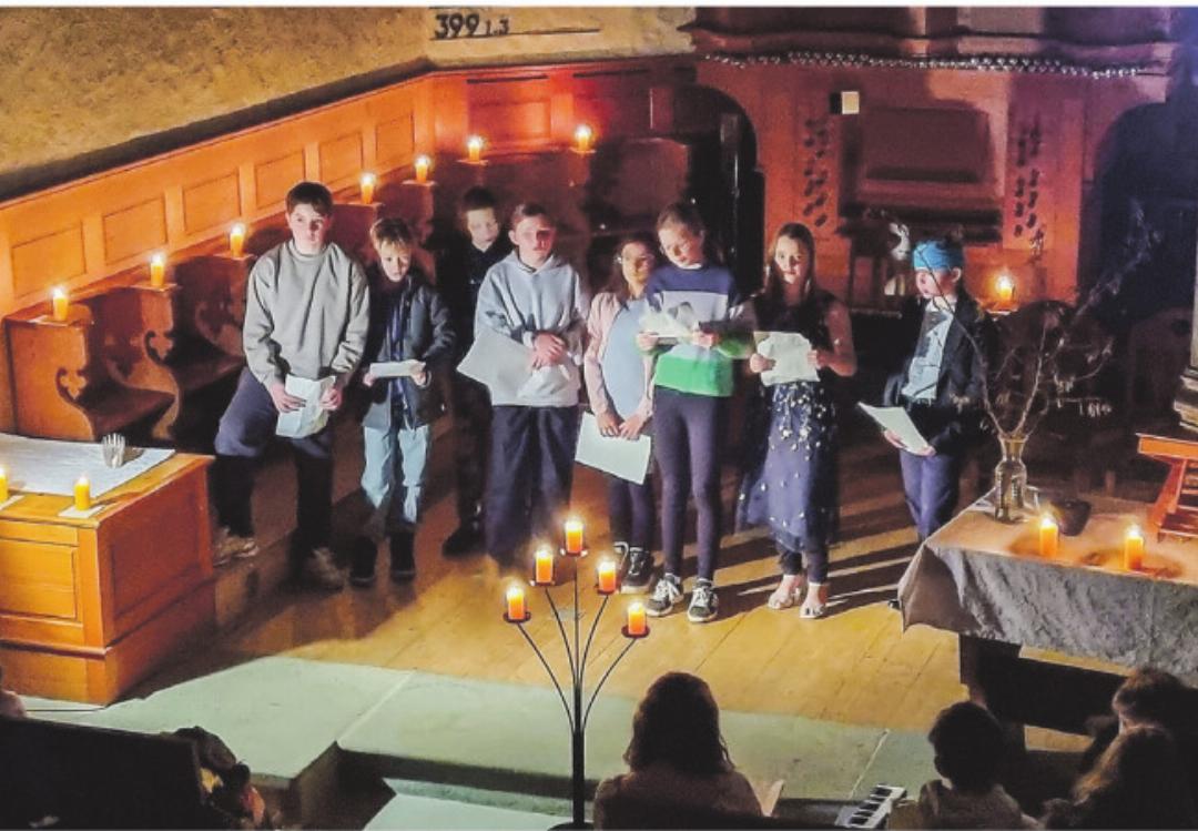 So liefen beide Gruppen gleichzeitig ab zur Kirche in Aawangen. Es war noch dunkel und nur ein paar Kinder erleuchteten den Weg mit Fackeln und Laternen. Eltern, Verwandte, Bekannte und die Lehrpersonen sind auch mitgelaufen. Das war eine schöne Stimmung.