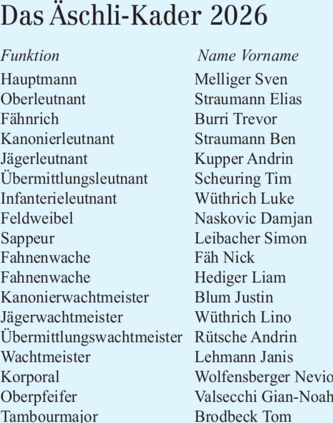 Am Neujahrstag fanden in Elgg wie jedes Jahr die Äschliwahlen statt. Zum Hauptmann für das Jahr 2026 wurde Sven Melliger gewählt. Zudem wurden alle Posten des Kaders besetzt. Zahreiche Elgger und Elggerinnen nahmen am Anlass teil.