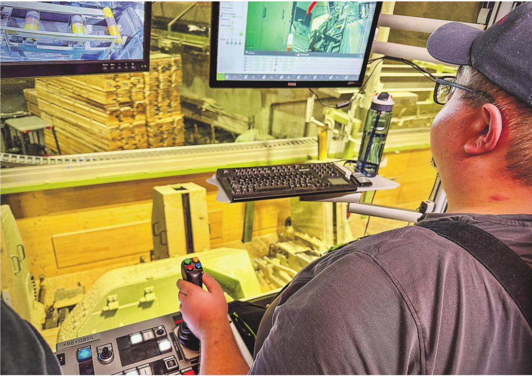 Die Gäste erhielten einen Einblick in die vielen Arbeitsschritte, die ein Baumstamm von der Anlieferung bis zum fertigen Produkt durchläuft – ob als Hausbauteil, Möbelstück oder Küchenschrank. Am Anfang der Reise steht der Rundholzplatz. Jeder Stamm wird geschält, vermessen, auf seine Qualität überprüft und schliesslich auf die gewünschte Länge gesägt. Fällt beim Scannen eingewachsenes Eisen oder ein Nagel nicht auf, kann es teuer werden: «Eisen im Holz verursacht grossen Schaden. Im besten Fall kann das Blatt neu geschärft werden, im schlimmsten ist es kaputt und muss ersetzt werden – das kostet schnell 2000 Franken», erklärte Luca Schwager mit Blick auf den Bildschirm, wo jeder Baumstamm analysiert wird. Mit dem «Taxi» Schienenkran ging es dem Stammlager entlang in die Sägerei. Von einer Passerelle oder aus der Glaskabine des Mitarbeiters konnte das Zersägen der Stämme in Bretter verfolgt werden. Kontrolliert wird die Maschine mittels Joystick und Bildschirm – eine Tätigkeit die enorme Konzentration erfordert, damit die Schnitte sauber und gerade ausgeführt werden. Zu schnelles Sägen oder eine falsche Lage des Stamms beeinträchtigen das Resultat und produzieren unnötigen Ausschuss.