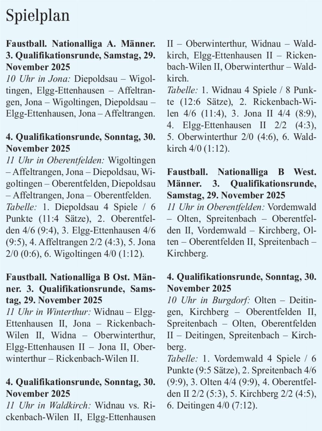 Affeltrangen, das bislang erst zwei Partien bestritten hat und von vielen als mögliches Überraschungsteam gesehen wird, hat am kommenden Wochenende die Möglichkeit, zum Spitzentrio aufzuschliessen. Denn die Affeltranger bestreiten gleich zwei Direktduelle mit vor ihnen klassierten Teams. Am Samstag messen sie sich mit Elgg-Ettenhausen und am Sonntag mit Diepoldsau. Ein wichtiges Kräftemessen steht zudem am Samstag in Jona auf dem Programm: Die bis jetzt noch punktelosen Gastgeber messen sich mit dem ebenfalls noch sieglosen Team aus Wigoltingen. Ein Erfolg in diesem Spiel würde dem Sieger etwas Luft verschaffen im Kampf gegen den Barrageplatz.