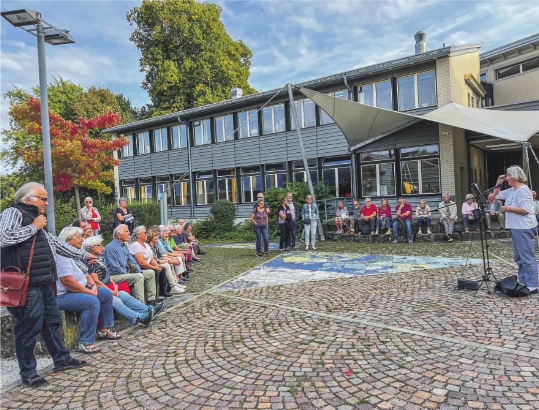 Weiter ging es zum Pausenplatz des Oberstufenschulhauses, wo Susie Scherrer mit der Erzählung «Lieber spät als gar nicht» die Zuhörenden in ihren Bann zog. Einleitend mit allgemeinen Überlegungen zum Thema «Erinnern und Vergessen», trug sie rückblendend eine Geschichte vor, die in einer längst vergangenen Schulzeit spielt. Sie handelt von einem Schüler, der vom Lehrer grob schikaniert wird. Die Klasse taut erst auf, als ein Stellvertreter Menschlichkeit und echtes Interesse zeigt.